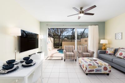 The home features it’s own screened-in lanai with a heated splash pool. Our home is a short walk to the large Olympic-sized community lagoon pool and waterslide at the clubhouse.